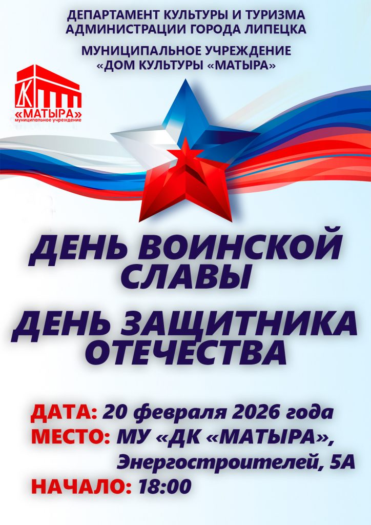 В преддверии самого мужественного и патриотичного праздника – Дня защитника Отечества, Дом культуры «Матыра» с радостью приглашает Вас на праздничный концерт, который станет настоящим подарком всем, кто стоит на страже мира и спокойствия нашей Родины. В этот день на нашей сцене выступят лучшие творческие коллективы, которые подарят вам незабываемые эмоции, яркие номера.